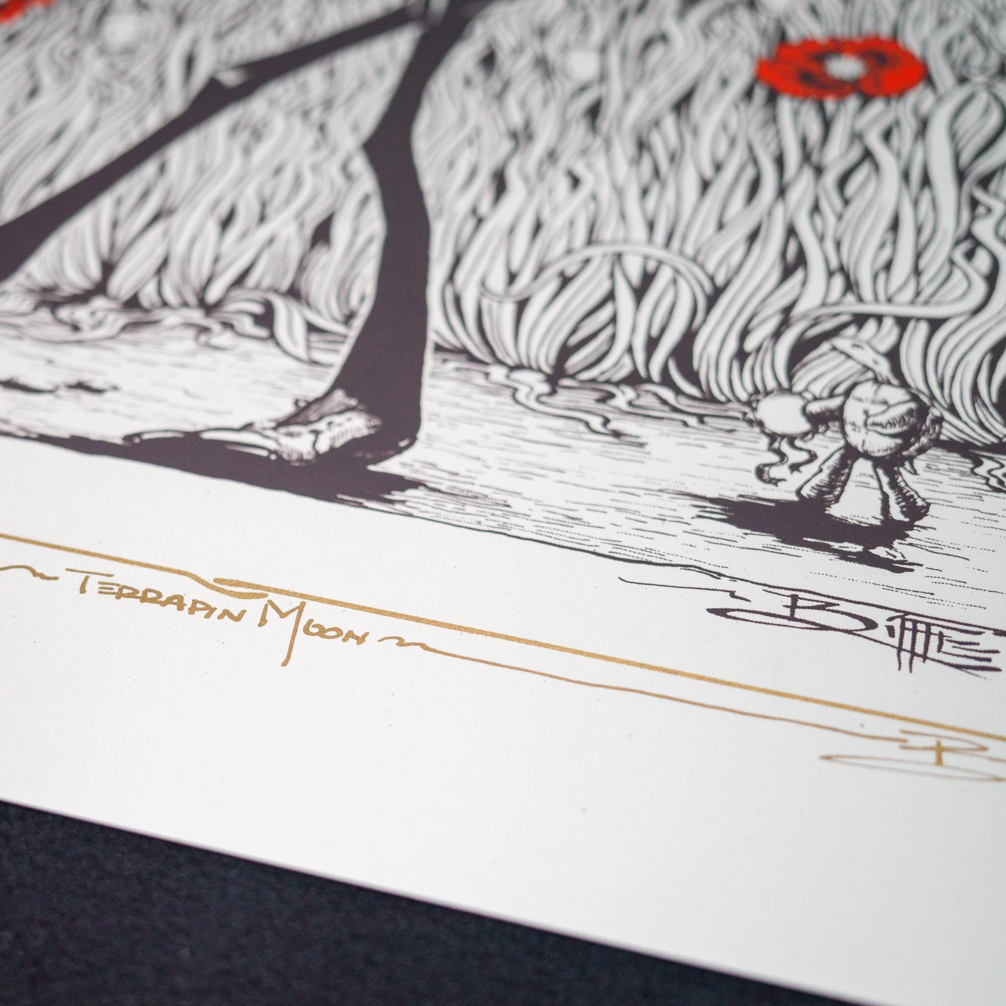 The "Terrapin Moon" screen print by Richard Biffle is a limited edition artwork. It is a 4-color screen print with metallic ink on French paper. The edition is limited to 111 signed and numbered copies, emphasizing its exclusivity and collectible value. This artwork is a testament to Biffle's unique artistic style and his connection with the themes associated with the Grateful Dead.